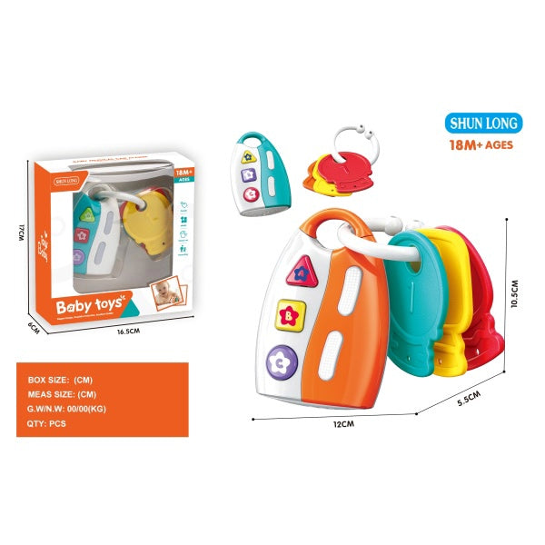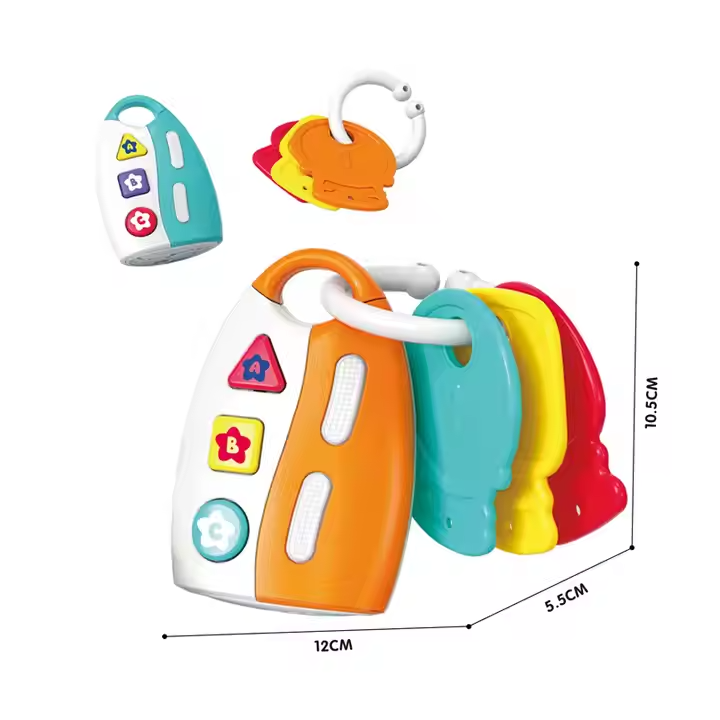 Această jucărie adorabilă pentru bebeluși imită un set real de chei auto, fiind perfectă pentru micuții curioși care adoră să exploreze obiectele din jur. Concepută cu un design realist, jucăria include un breloc principal cu butoane colorate marcate cu A, B și C, precum și chei atașate, ușor de prins și manipulat de către cei mici.