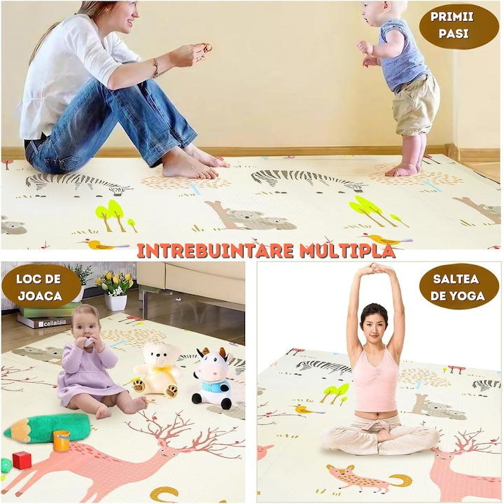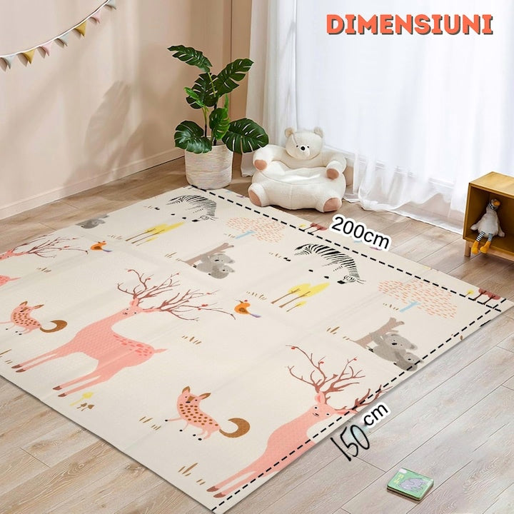 Covorașul de joacă creează un mediu plăcut și sigur, perfect pentru explorările zilnice ale celor mici. Este realizat din materiale moi, non-toxice și prietenoase cu pielea delicată a copiilor. Suprafața sa amortizează eventualele căzături și previne accidentele, oferindu-le părinților liniștea de care au nevoie.