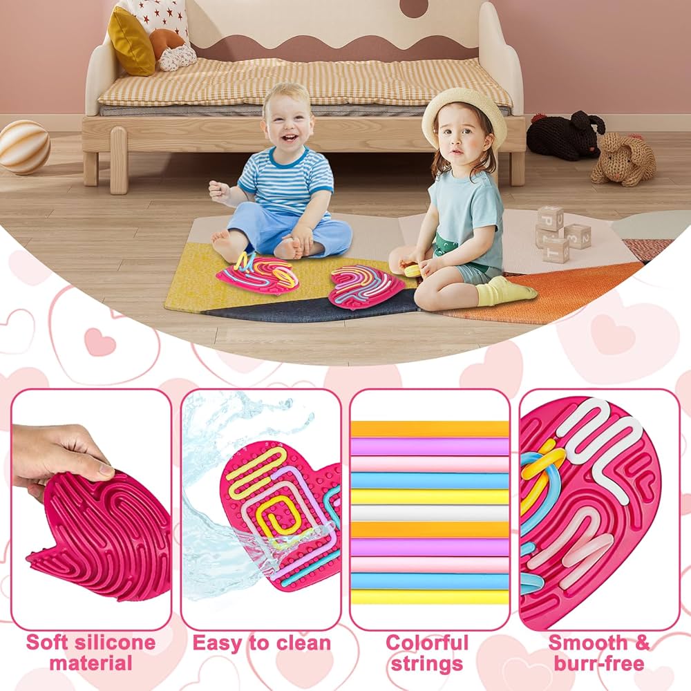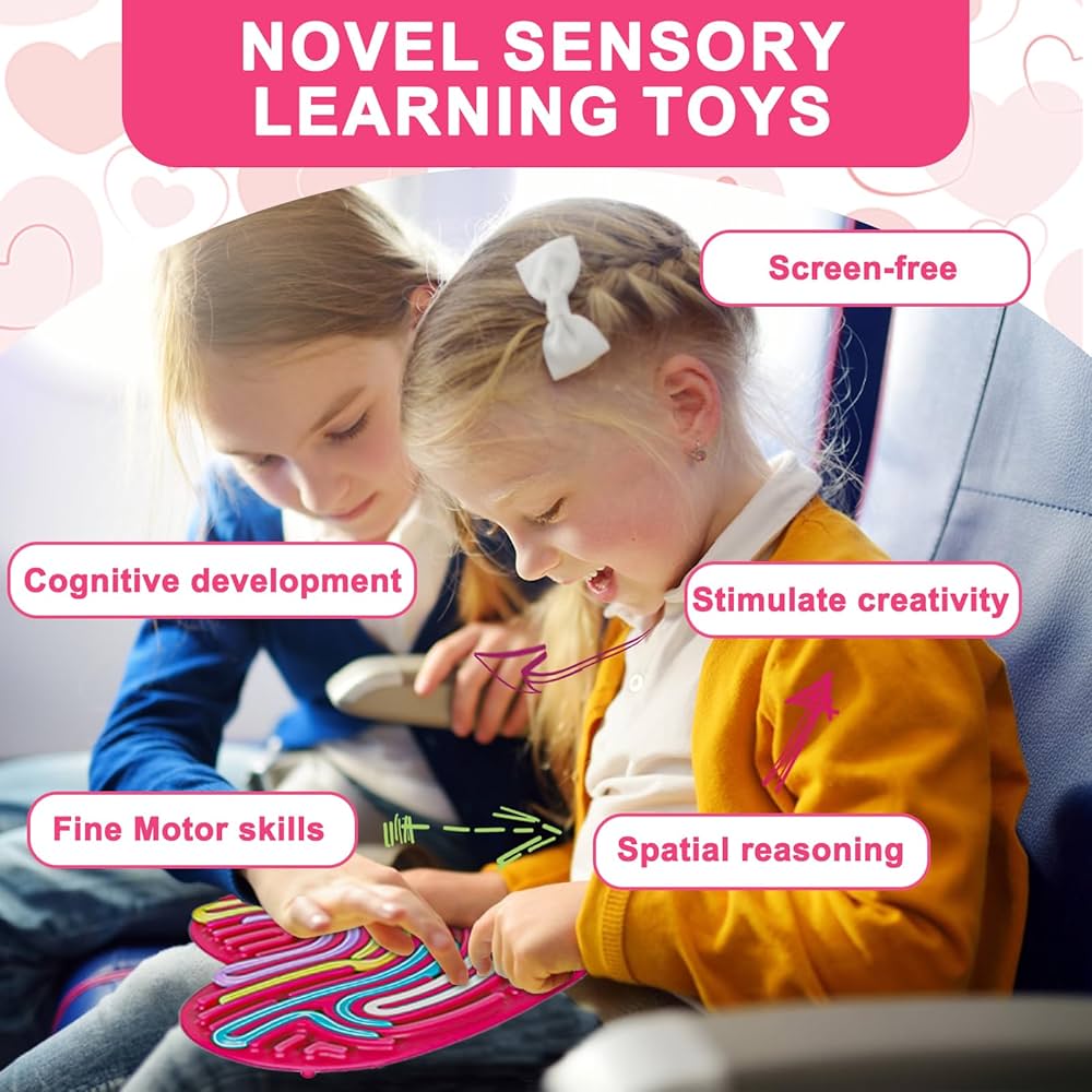 Oferă copilului tău un moment de calm și explorare, fără stimuli digitali. Tabla inimă/stea de activități senzoriale transformă orice spațiu – avion, mașină, sala de așteptare sau restaurant – într-un loc sigur pentru joacă discretă și fără murdărie. Este ușor de transportat.
