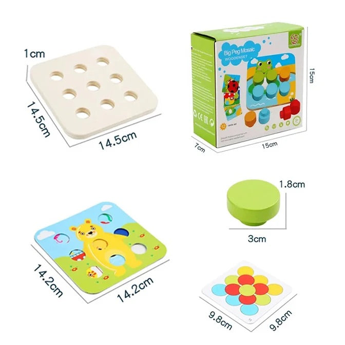 Setul include o tablă suport din lemn prevăzută cu găurele, 16 butoni mari colorați (în 4 culori diferite) și 6 planșe reversibile cu modele variate. Cei mici pot așeza piesele fie liber, pentru a crea propriile mozaicuri, fie urmând modelele ilustrate pe planșe.