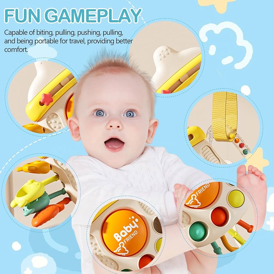 O jucărie versatilă, perfectă pentru stimularea dezvoltării bebelușului! Concepută pentru a antrena abilitățile motorii fine și coordonarea mână–ochi, jucăria include butoane glisante, bule de apăsat și șfori moi care încurajează explorarea. Culorile vii sprijină dezvoltarea vizuală și ajută la recunoașterea nuanțelor.