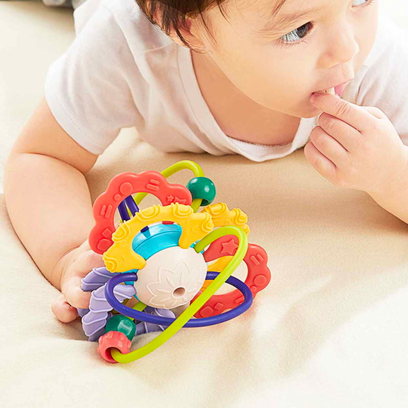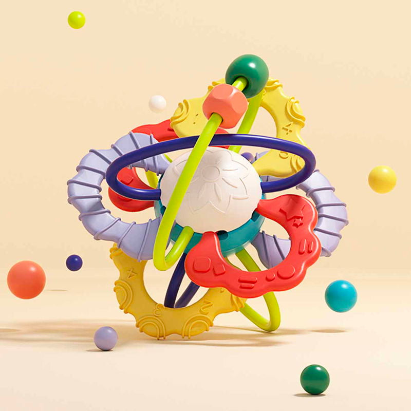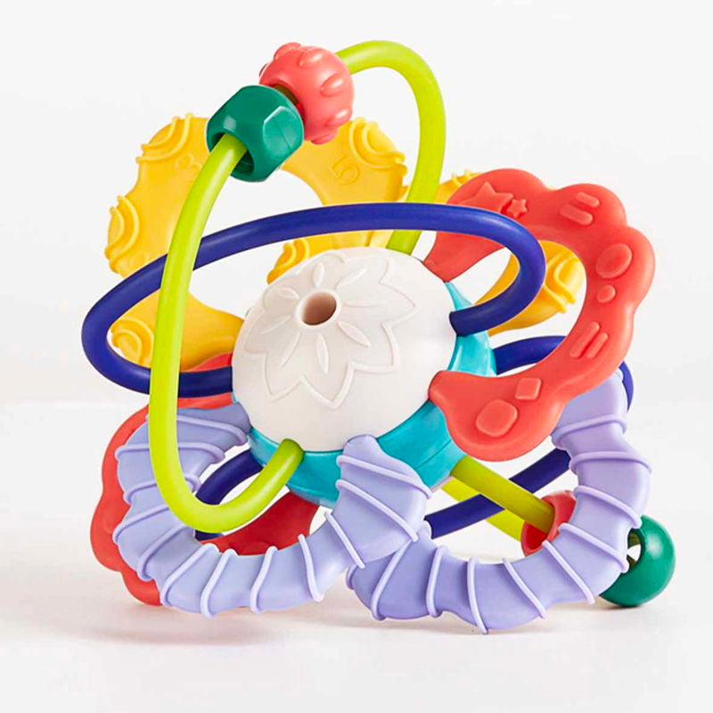 Fabricată din silicon gros și plastic ABS sigur, jucăria este perfectă pentru a fi mușcată fără griji. Zonele texturate masează delicat gingiile, oferind alinare în timpul erupției dentare, în timp ce micile bile colorate din interior adaugă o notă de veselie și relaxare sonoră.